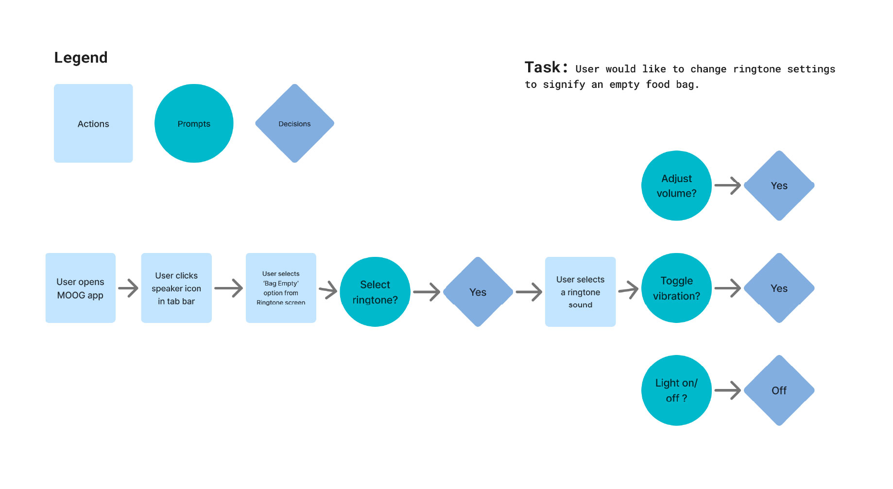 The analysis and ideation phase involved developing user personas to represent primary and secondary users and better understand their needs. A clear tone of voice and visual direction were established through moodboarding to guide the overall experience. Product and user flow diagrams were created to map out app navigation and device interaction. This phase translated research insights into a structured, user-centered framework for both the app and wearable device.